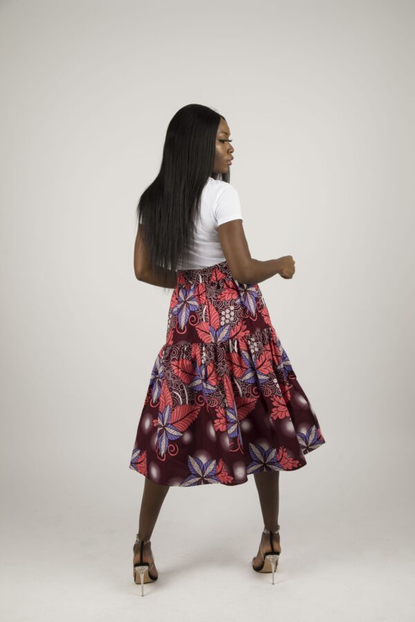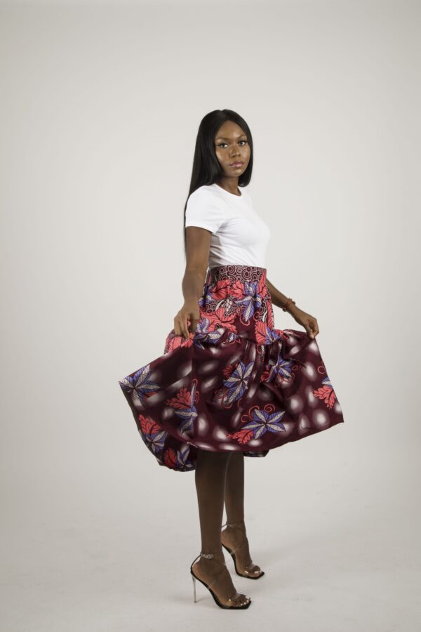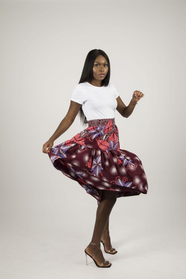 This midi length skirt is fitted to the hips and  flares into fullness with a high ruffle. A floral print of wine coloured floral ankara fabric. Rock this skirt to work or your next social gathering.